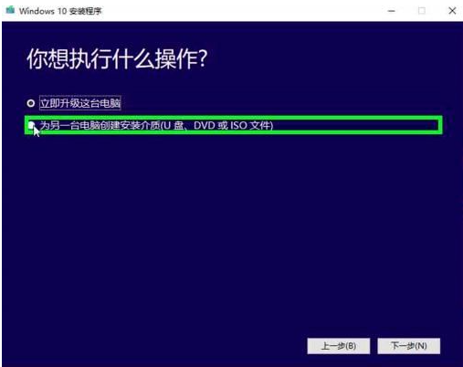 4、此時有兩個選項,根據自身需求選擇不同選項,小編在這里選擇“為另一臺電腦創建安裝介質(U盤、DVD或ISO文件)”,選擇完成后點擊下一步。