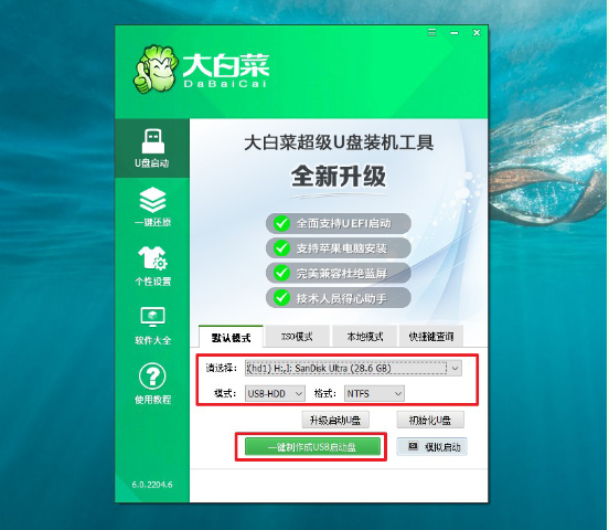 1、首先電腦安裝并打開大白菜U盤啟動盤制作工具,插入空白u盤,然后打開軟件制作U盤啟動盤。