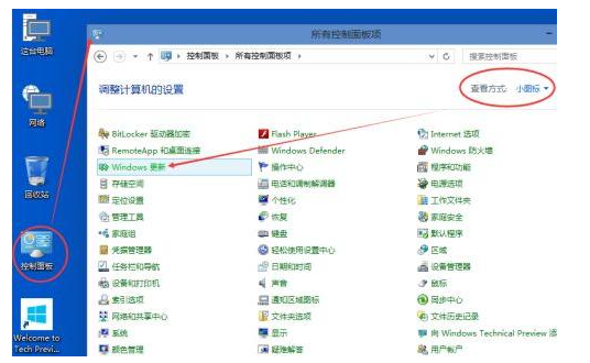 1.打開桌面上的控制面板,將查看方式改為小圖標,隨后點擊進入Win10更新。