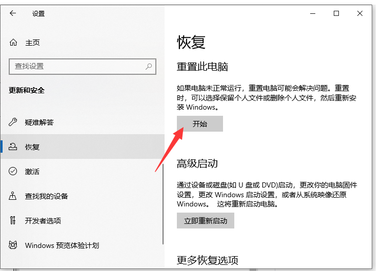 3.選擇左側的恢復,再選擇右側選項中的的開始按鍵重置電腦。