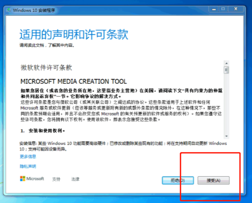 2、點擊打開下載的 MediaCreationTool2004.exe Windows 10 安裝工具,選擇點擊接受。參考下圖: