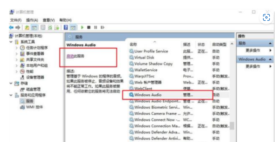 2、打開計算機管理器中的“服務和應用程序”,如圖所示,點擊“服務”,在右邊的窗口中找到“Windows Audio”服務,點擊Windows Audio服務并鼠標右鍵設置“啟動”即可。