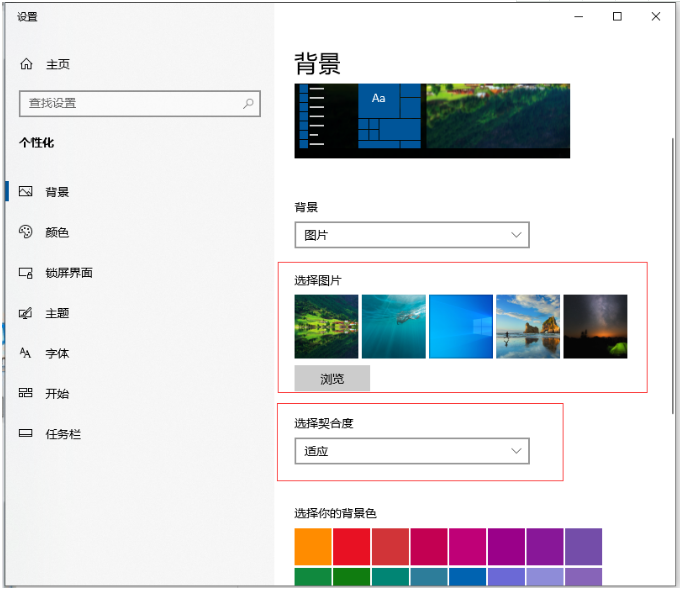 3、該選項對應的右邊欄,我們能夠看到"選擇圖片",這里面就是系統自帶的幾幅圖紙了,我們點擊選擇以后,就可以將其設置成桌面背景啦。