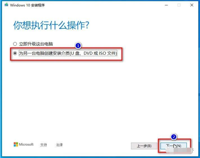 3、選擇“為另一臺電腦創建安裝介質(U盤、DVD或者ISO文件)”,進入“下一步”。