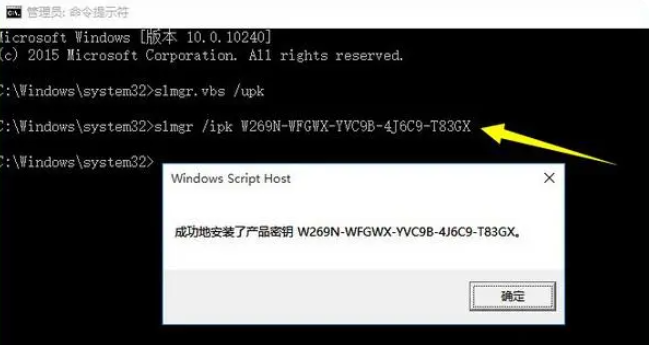 2、打開命令窗口,復制命令slmgr /ipk W269N-WFGWX-YVC9B-4J6C9-T83GX粘貼,按回車鍵執行安裝密鑰。