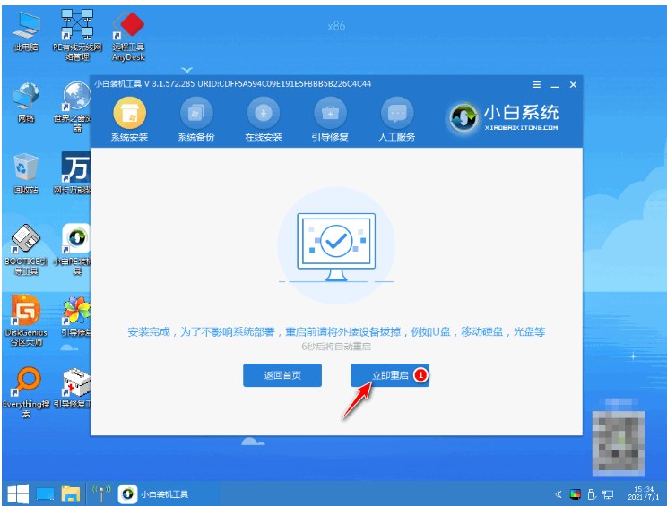5、電腦在 PE 系統中,裝機工具會自動幫我們重裝win10系統,完成后再次點擊立即重啟電腦。