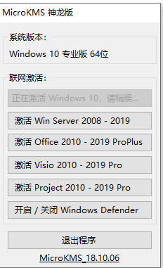 kms神龍版是一款非常棒的KMS激活工具,它的主工功能就是可以激活Windows8/8.1、Win10、Win11系統,同時也支持Offi能2010-2019的KMS激活,而且該工具,純凈無捆綁,激活也比較安全
