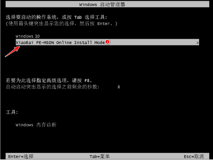 4、電腦重啟之后將會進入了開機選項界面,進入xiaobai-pe系統。