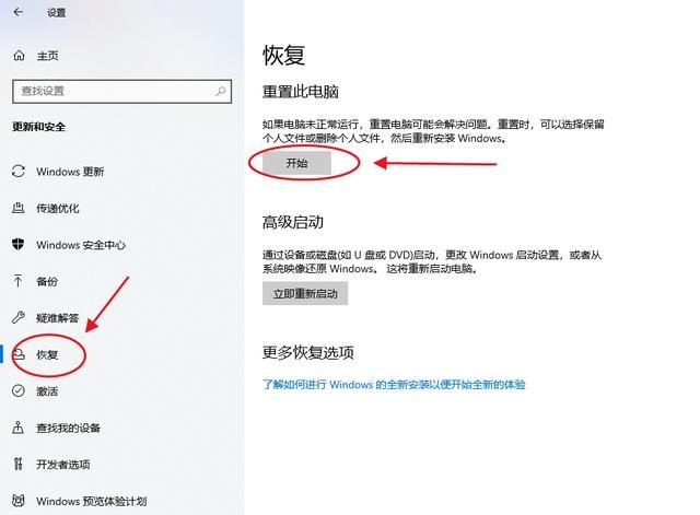 2、點擊“恢復”,選擇“開始”