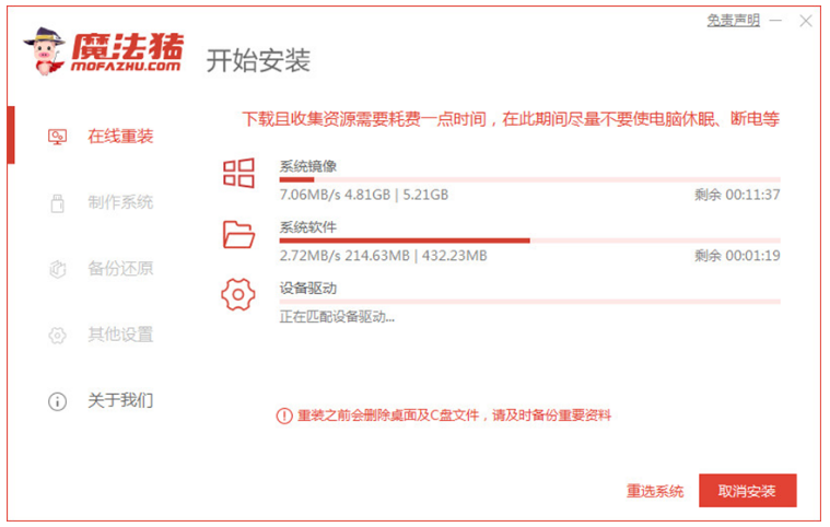 5、進入pe系統后,魔法豬裝機工具就會自動開始安裝win10系統。