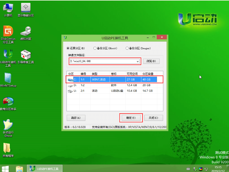 2、打開桌面上的u啟動PE裝機工具,選擇在u盤的win10系統鏡像,安裝在c盤,點擊確定。