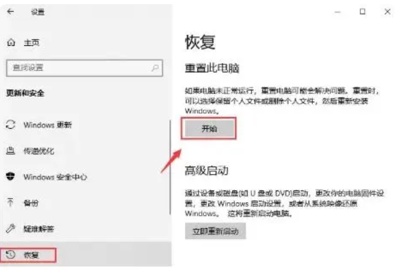 2.我們選擇【恢復】然后轉移到右側窗口中選擇重置此電腦功能下的【開始】按鈕。