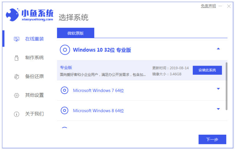 1、先在電腦上下載安裝好小魚一鍵重裝系統工具打開,選擇我們需要安裝的win10系統,點擊安裝此系統,點擊下一步。