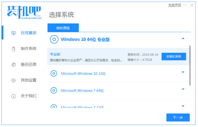 1、下載安裝裝機吧一鍵重裝系統工具,雙擊打開,選擇需要安裝的win10系統,點擊下一步。