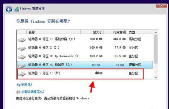 3、再下來這一步很重要,接下來需要選擇Win10安裝路徑,這里需要選擇安裝到最開始Win7創建的新分區,這里需要選擇H盤中,然后再點擊“下一步”即可,如下圖所示。