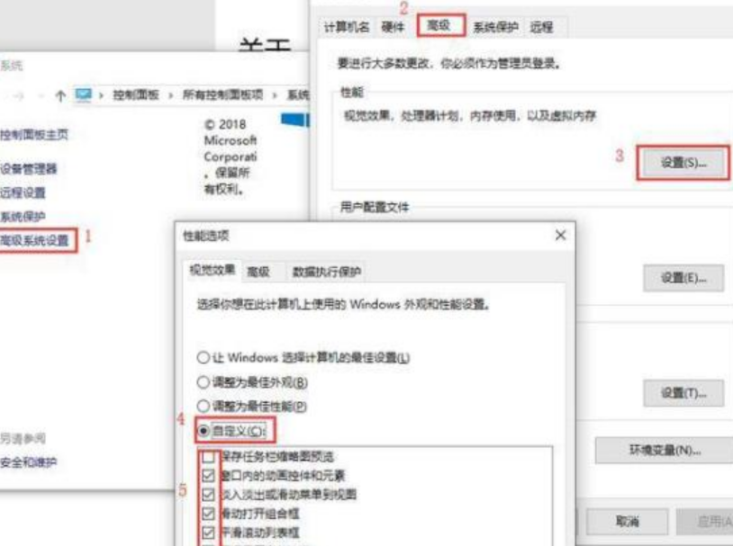 右擊"此電腦"點擊屬性,逐步打開高級系統設置--高級--性能--設置--自定義,關閉關閉淡出淡入效果之類的特效,確定完成。