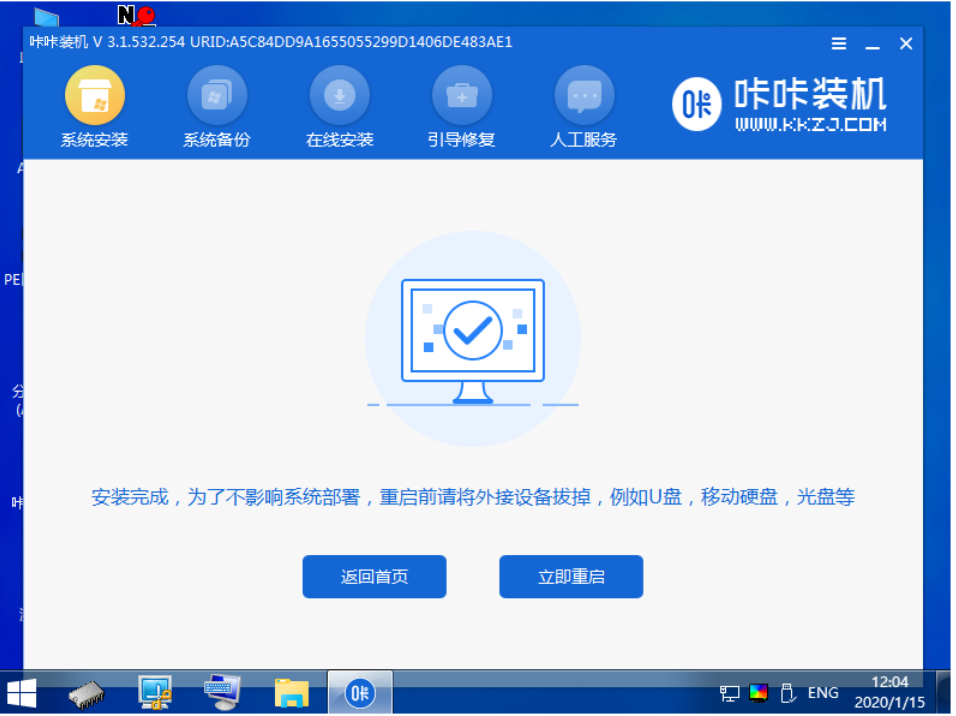 4、在pe系統內,等待咔咔工具安裝win10系統,安裝完成后自動重啟電腦。
