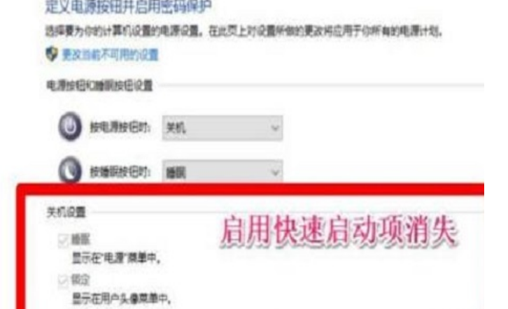 6.在窗口中,我們可以看到關機設置下的啟用快速啟用不見了,就意味著快速啟動已經設置為關閉的狀態;