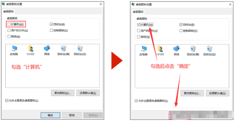 3.這里能看到一個“計算機”,這就是我的電腦啦!但是它的小方格是空的,也就是未勾選狀態,我們給它點擊一下打上勾后就可以“確定”啦!