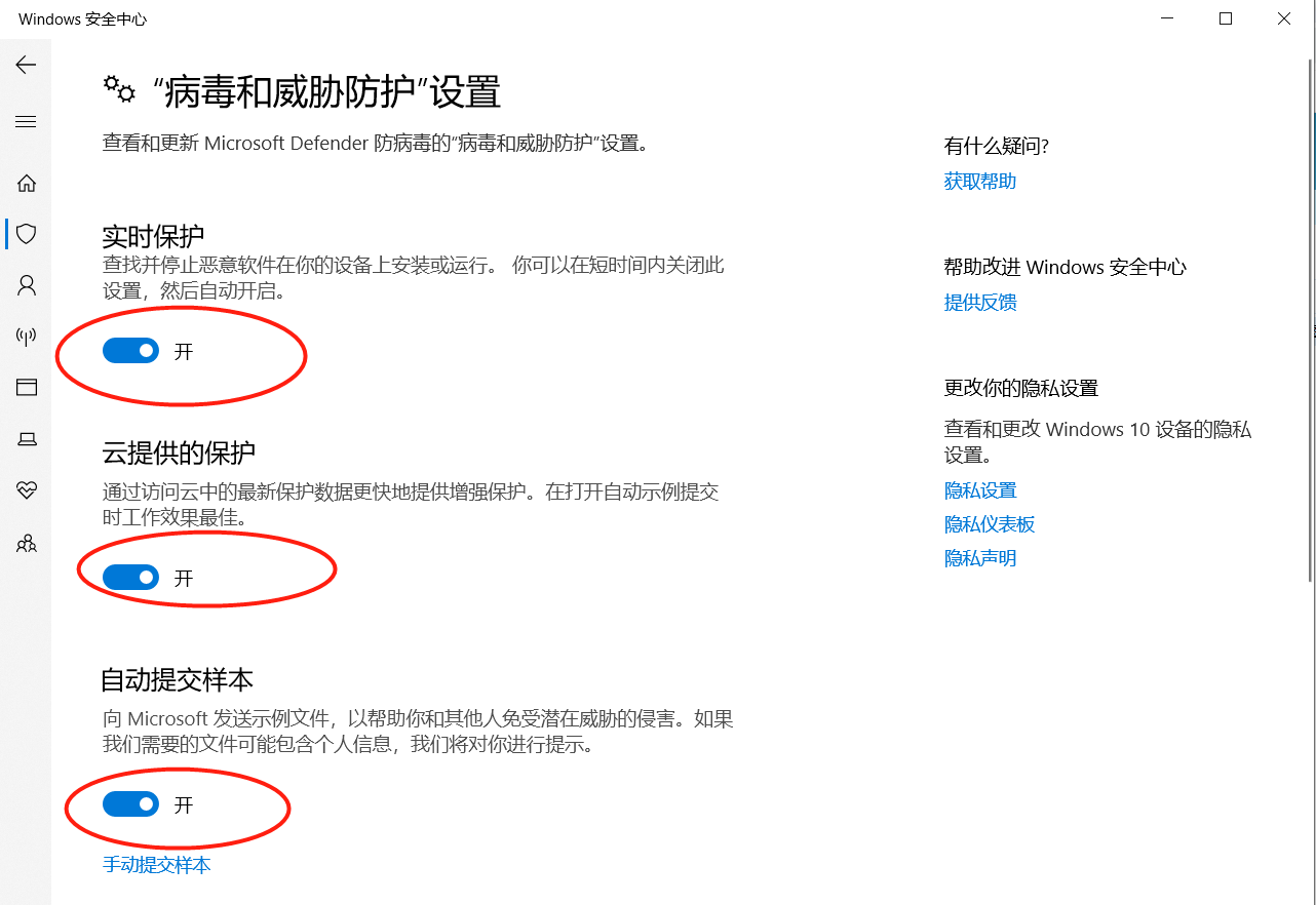 5、在“病毒和威脅防護”設置界面,關閉“實時保護”,關閉“云提供的保護”,關閉“自動提交樣本”三個選項,即可關閉Windows Defender。