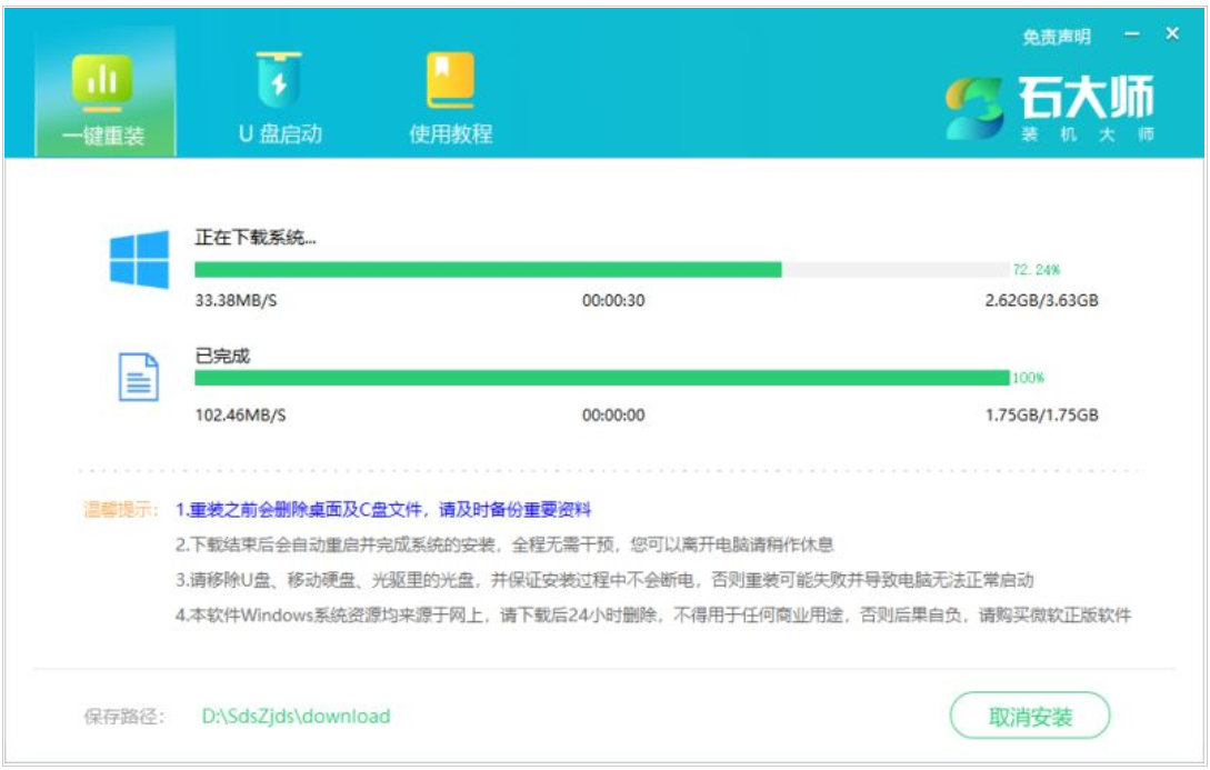 2、等待軟件下載系統鏡像、設備驅動等重裝需要的資源。