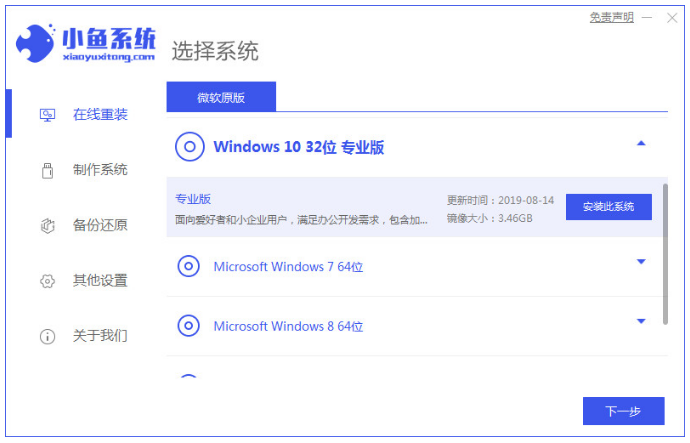 1、我們首先打開下載安裝好的小魚一鍵重裝軟件,然后選擇需要安裝的win10系統進行安裝,點擊安裝此系統,點擊下一步。