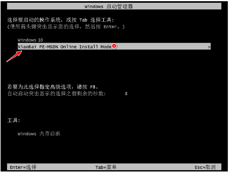 4、重啟電腦之后,選擇第二個xiaobai pe-msdn online install mode按回車鍵進入pe系統。
