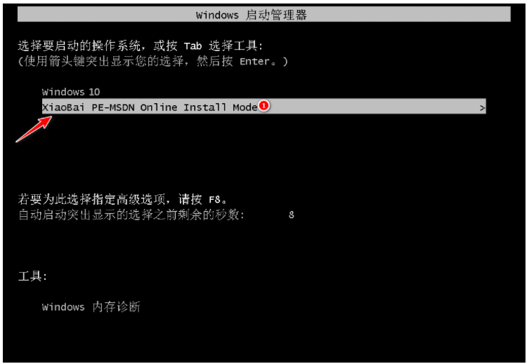 4、重啟電腦后,接著選擇 XiaoBai PE-MSDN Online Install Mode,按回車鍵進入 Windows PE 系統。