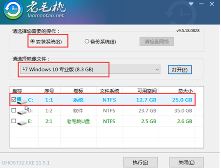 4、打開老毛桃一鍵裝機軟件,選擇系統鏡像安裝到系統盤c盤,點擊執行。