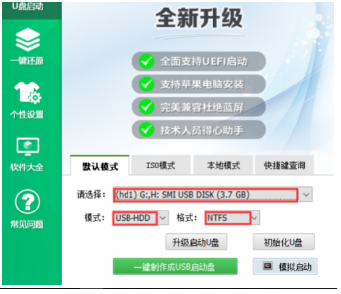 3.點擊USB-HDD,選擇NTFS,然后勾選一鍵制作USB啟動盤。