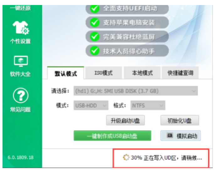1.首先鼠標雙擊打開超級U盤機工具,勾選主頁界面上的“U盤啟動”模塊,點擊【默認模式】。