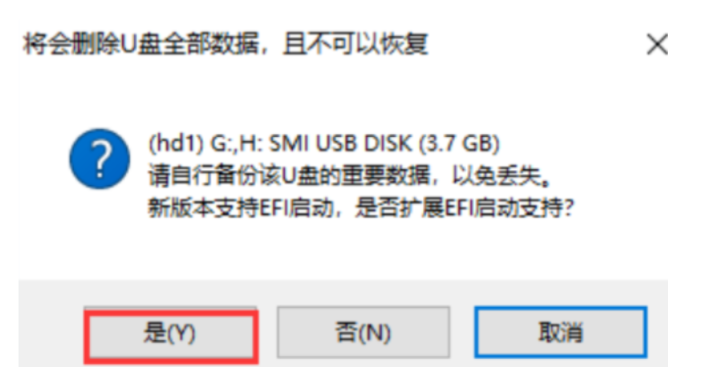 4.點擊一鍵制作,【U盤數據刪除且不可恢復】的窗口界面,點擊是按鈕。