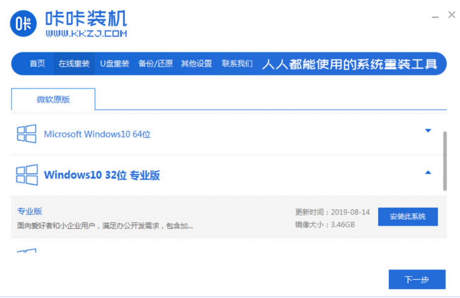 1、首先下載咔咔裝機工具,點擊在線重裝系統。選擇需要安裝的系統版本,點下一步。