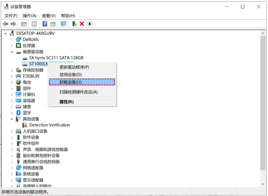2、右鍵單擊磁盤設備中的SD卡,然后選擇卸載設備。