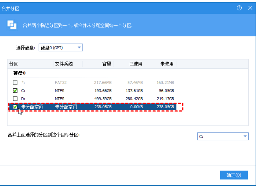 3、在彈出的窗口中,如下圖,勾選需要合并的未分配空間,當有多個未分配空間時可以同時選中多個,然后點擊“確定”,返回到主界面。