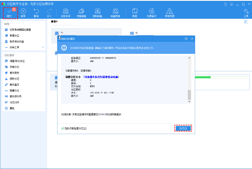 2、確認要執行的操作,然后點擊工具欄的“提交”按鈕,在彈出的窗口點擊“執行”,操作過程中可能要重啟電腦,在彈出的窗口中點擊“是”。