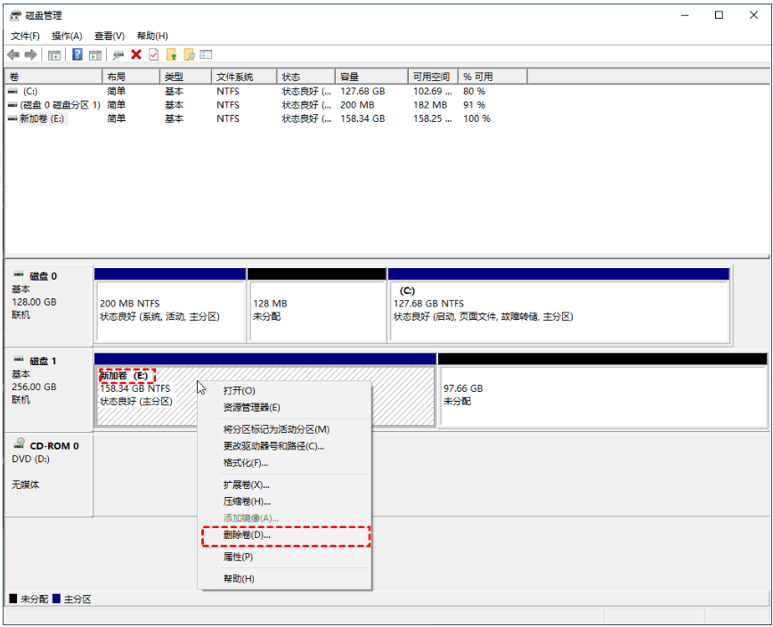 2、找到并刪除要合并的分區例如,要將D盤合并到C盤,需要刪除D。右鍵單擊D,然后選擇“刪除卷”。