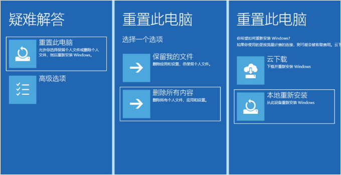 依次選擇重置此電腦 - 刪除所有內容 - 本地重新安裝。