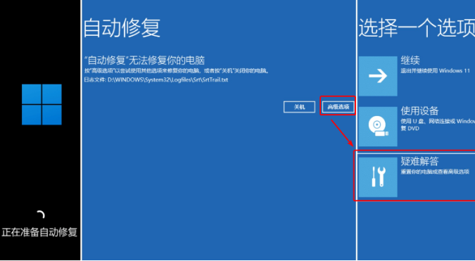 等待電腦進入修復界面 - 查看高級選項 - 疑難解答。