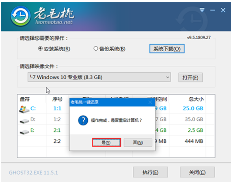 5、 打開老毛桃一鍵裝機,選中win10系統鏡像,安裝在C盤,點擊“執行”進入下一步即可。