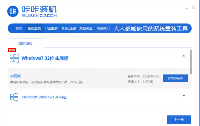 咔咔一鍵三步重裝系統如何操作呢?首先打開咔咔軟件,選擇需要安裝的win7系統,點擊安裝此系統,點擊下一步。