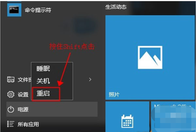 1、打開“開始菜單”,點擊“電源”選項,會彈出一個選擇菜單,此時按住“Shift鍵”, 然后點擊“重啟”選項。