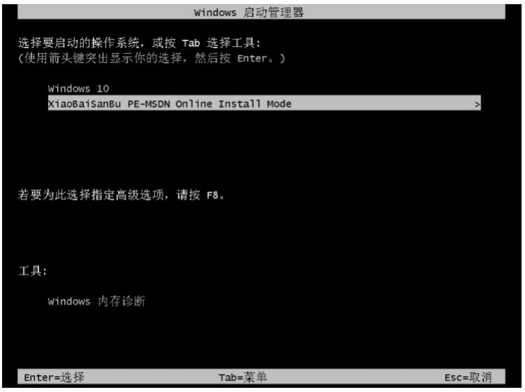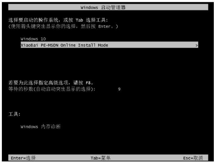 4、選擇進入啟動管理器界面,選擇第二項xiaobai-pe系統按回車鍵進入pe系統。