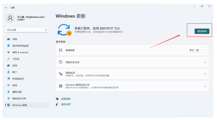 3、打開windows更新后,點擊右側“繼續更新”按鈕即可完成win11的更新。