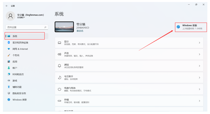 2、點擊進入左側的“系統”界面,再點擊右上角的“Windows更新”。