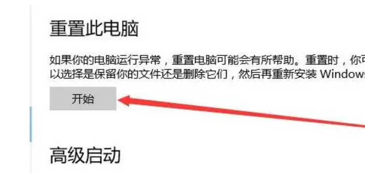 5、隨后在彈出的窗口中,點擊重置此電腦下面的開始。