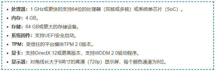 1、按照微軟公布的安裝Windows 11的基本硬件要求和系統要求信息,判斷自己的電腦配置是否符合要求。具體的要求如圖所示: