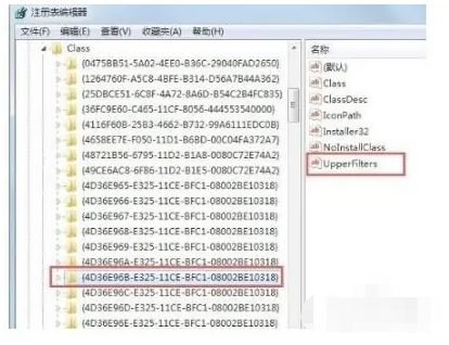 3.在Class項下找到【{4D36E96B-E325-11CE-BFC1-08002BE10318}】項,點擊打開,在右方找到【UpperFilters】值將其刪除。