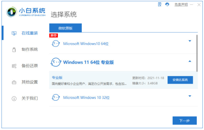 1、在電腦上下載安裝好小白一鍵重裝系統工具并打開,在線重裝界面即可選擇win11系統,點擊安裝此系統,點擊下一步。