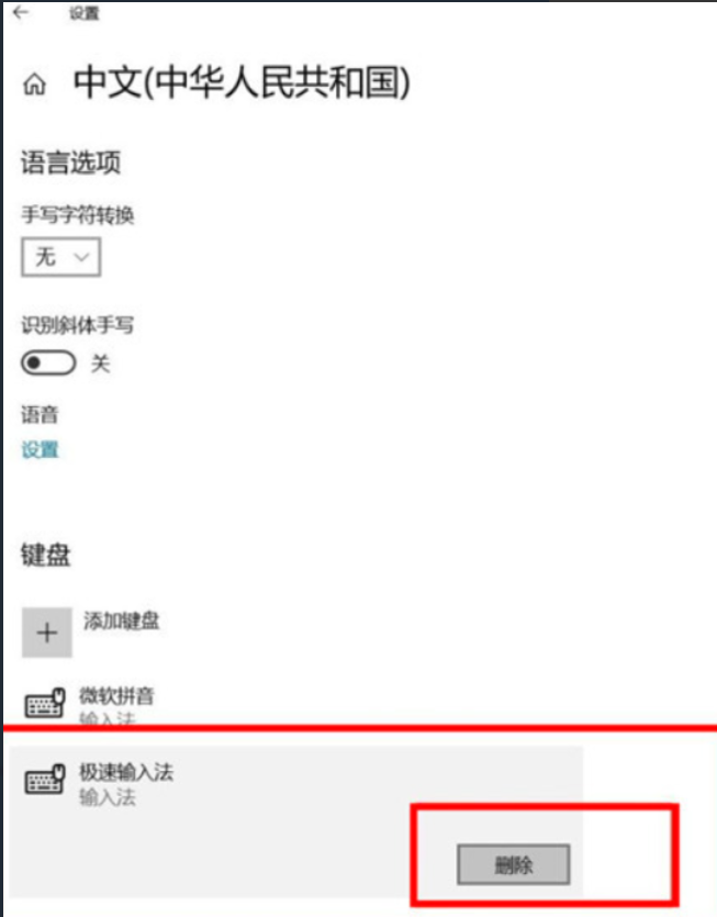 3、鼠標單擊進入,找到“極速輸入法”并單擊,彈出“刪除”選項單擊即可。